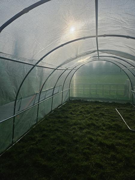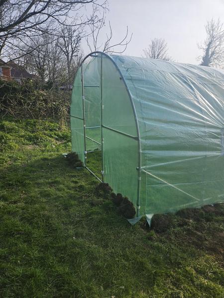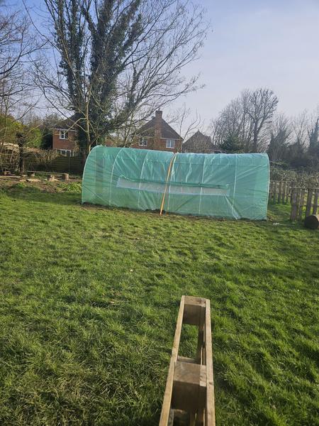 We took full advantage of the little bit of sunshine we had today! We now have a cover on our polytunnel and it is secured in place. Next ... the door!