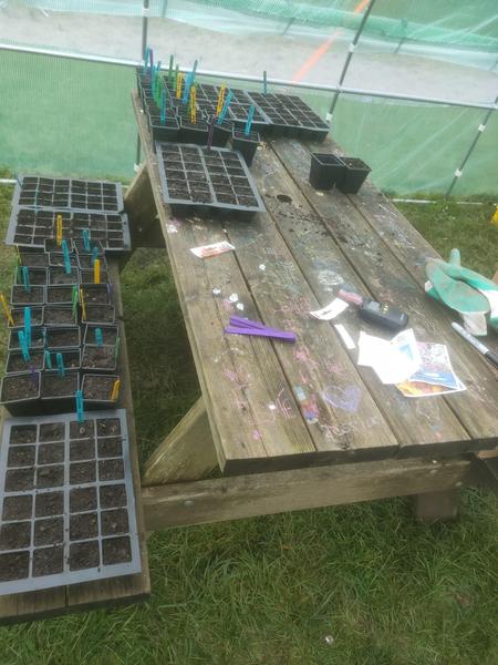 Why does it always rain on a Tuesday! We spent lots of time sheltering inside the polytunnel today but it does mean we now have lots of seeds planted! I wonder what will germinate first!?