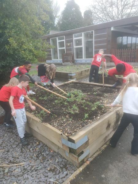 Due to another rainy Tuesday we managed to get outside during Red Nose Day and start working on the raised beds. Lots of weeding and preparing the soil ready to plant our onions!