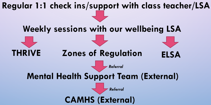This support is not necessarily isolated to one intervention at a time in the order shown; we may feel a child would benefit from regular check ins alongside weekly wellbeing support, or perhaps they need a Zones of Regulation intervention whilst we wait for a CAMHS referral to go through. Perhaps a THRIVE intervention alone is enough to address their area of need and we just need to check in regularly to ensure all is well. So this support can take on a variety of forms and is very much about the needs of the individual.