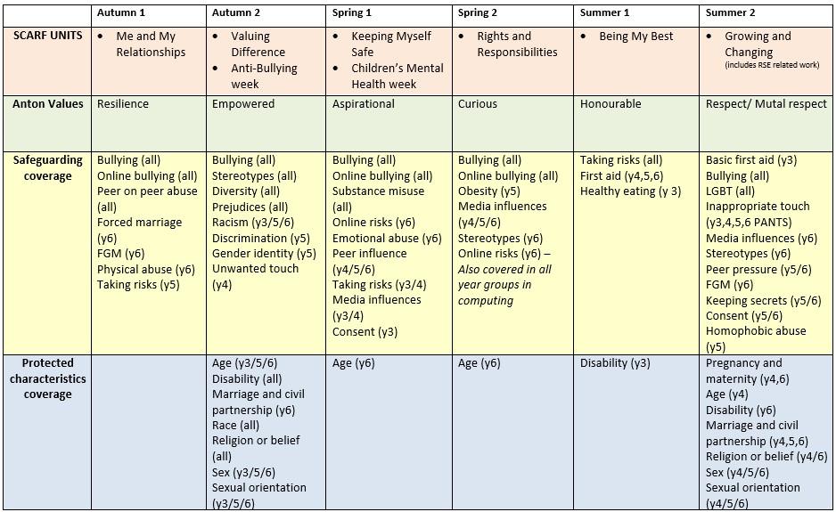 Please see below our safeguarding curriculum. This is taught in line with our PSHE Scheme SCARF. It repeats and embeds the importance of safeguarding yourself, others and your family.